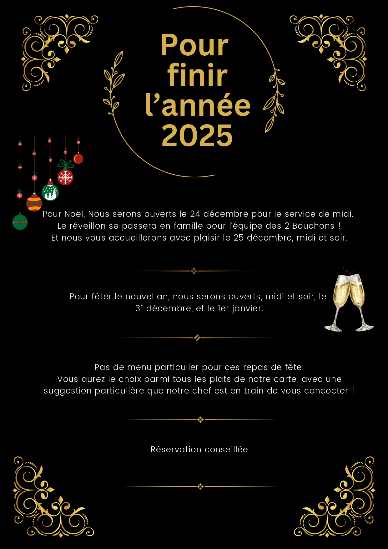 Les 2 Bouchons proposent bien plus qu'un simple repas. En plus de la restauration et du bar, ils se spécialisent dans l'organisation d'événements tels que les anniversaires, les séminaires et les occasions spéciales. Vous avez la possibilité d'organiser un repas de groupe ou de privatiser la partie cave à vins pour un évènement